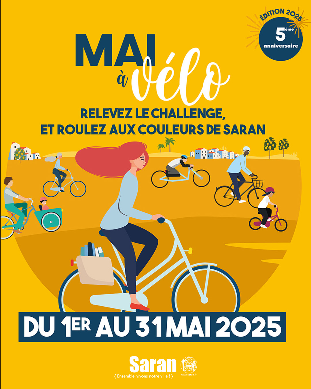 Du 1er au 31 mai 2025, rejoignez le groupe de la Ville de Saran et participez à la 5e édition du Challenge Mai à Vélo, en réalisant le plus de kilomètres au quotidien à vélo !